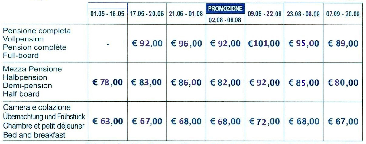 Die angegebenen Preise beinhalten: Mehrwertsteuer, Steuern (die 2013 eingeführte Kurtaxe in Höhe von 1,10 € pro Person / Tag ist nicht enthalten) und Hoteldienstleistungen.